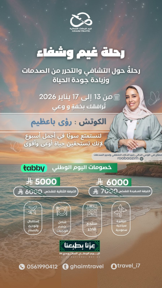 امنحي نفسك فرصة للهدوء، الاسترخاء، وإعادة اكتشاف ذاتك مع الكوتش رؤى باعظيم 🌿، حيث نأخذك في رحلة فريدة تجمع بين التشافي العاطفي والتجديد الداخلي وسط أجواء البحر الأحمر الساحرة.